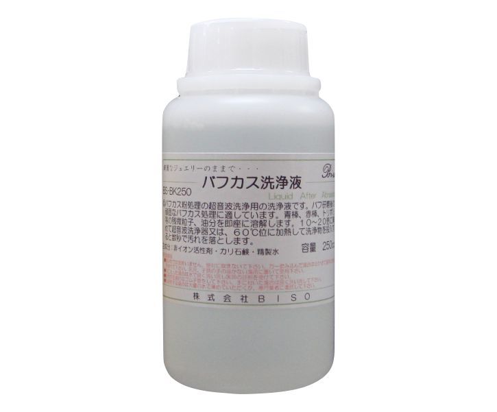 バフカス用洗浄液(250cc) BS-BK250 光りすぎシリーズ バフ研磨の頑固な汚れ落としに最適な洗浄液です。 1,080円(税別) |