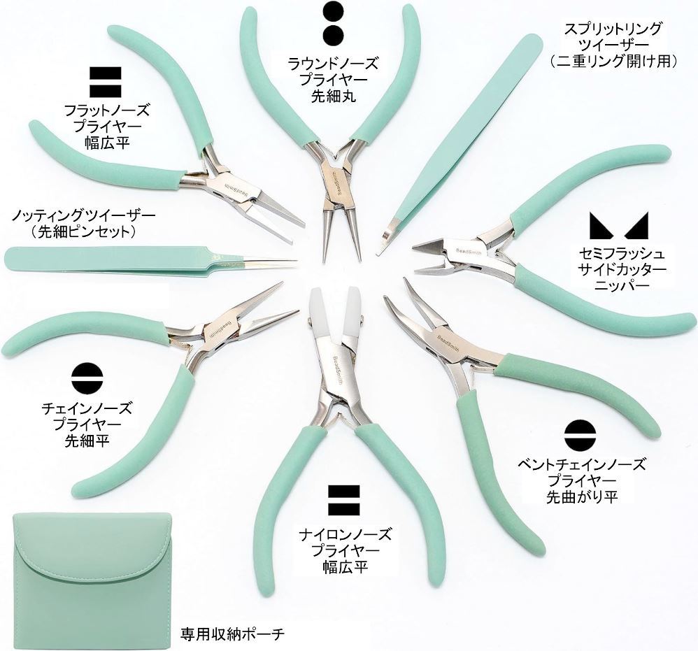 | セット内容 / 使用用途 | ラウンドノーズプライヤー (先細丸):9ピン・Tピンを丸める際に使用 チェインノーズプライヤー (先細平):丸カン開けやつぶし玉をつぶす際に使用 ベントチェインノーズプライヤー (先曲がり):真っ直ぐなヤットコでは届きにくい部分に便利 フラットノーズプライヤー (幅広平):爪を折ったりボールチップを閉じる際に使用 ナイロンノーズプライヤー:ナイロン製の先端により、金属を傷つけずに加工が可能 サイドカッター (ニッパー):ワイヤーやコード、ピン類のカット時に使用 ノッティングツイーザー (先細ピンセット):糸の結び目を作ったり細かなパーツの保持に使用 スプリットリングツイーザー (二重リング開けピンセット):コイルの隙間を開ける際に使用 |