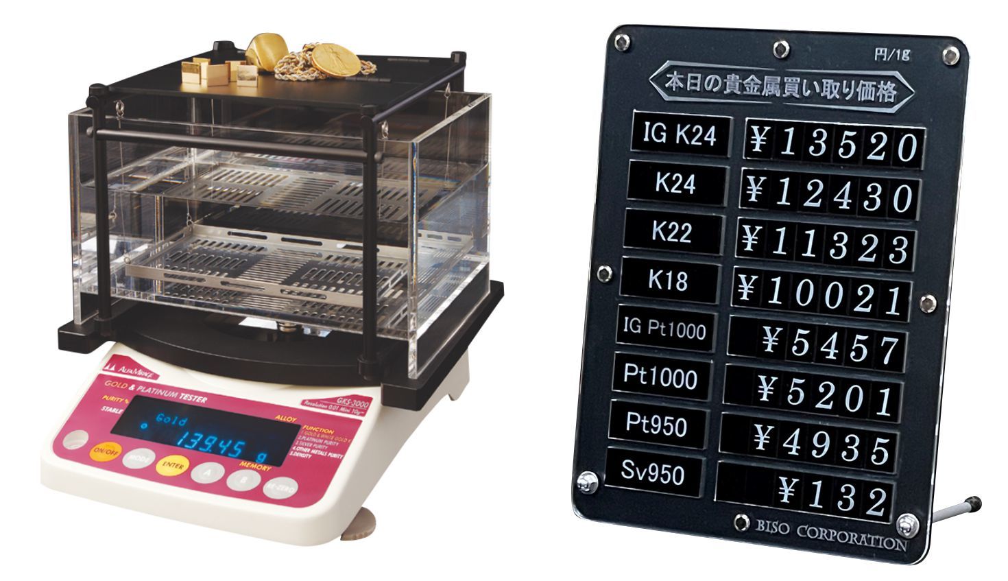 信頼のある貴金属テスターと買取りプライスボードのお得なセット販売です。