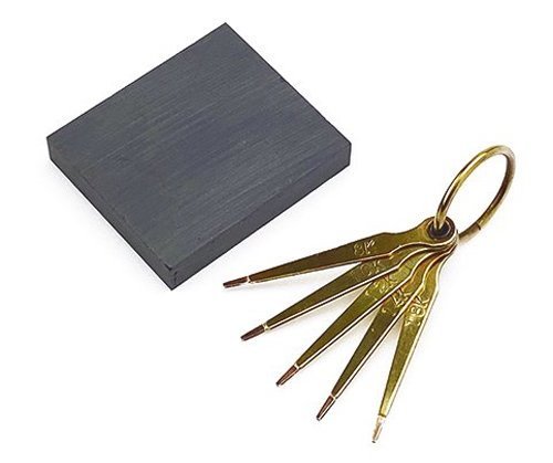 試金棒5本、試金石セット K8,K10,K12,K14,K18 金製品を目視で鑑別判断する道具です。貴金属鑑定査定の補助に使用できます。 27,550円(税別) |