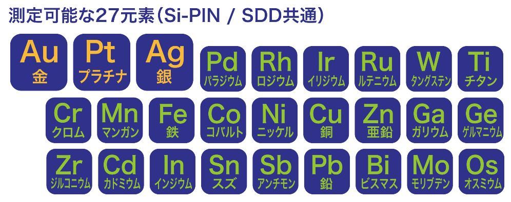 測定可能な元素 | <27元素> Au Pt Ag Pd Rh Ir Ru W Ti Cr Mn Fe Co Ni Cu Zn Ga Ge Zr Cd In Sn Sb Pd Bi Mo Os |