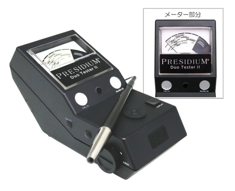 ジェムテスターⅡ PRESIDIUM(プレシディアム製) 宝石判定器、色石や類似石の判定補助に有効です。 10倍トリプレットルーペ付 51,300円(税別) |
