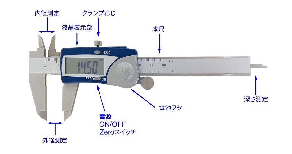 0~100mmの範囲で測定できます。ゼロ調整機能付きなので、ボタンを押すだけでゼロ