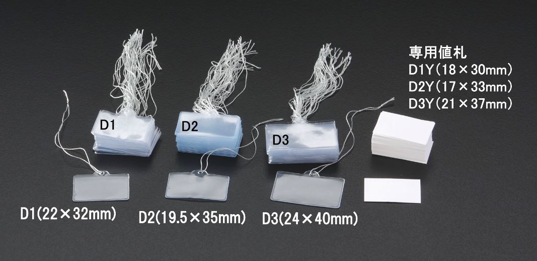 ビニール製値札ケース、タグ付 3種類、各100枚入 透明のタグ付き値札ケースと値札です。 ケース/3,150円(税別) 紙値札/650円(税別)100枚入 レターパックライト対応 |
