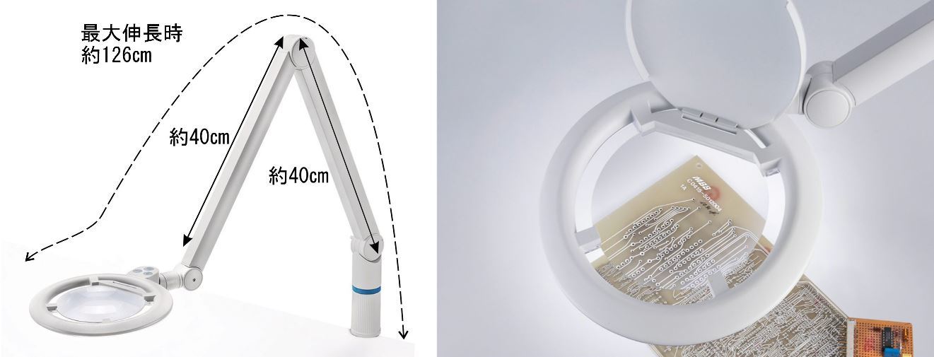 両手が使えるライト付きアーム式ルーペ、様々な業界で採用されてます。