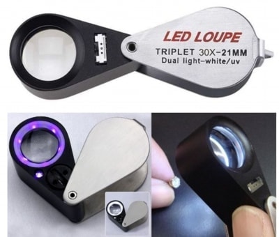 UV+LEDライト付30倍ルーペ ダイヤモンドの判定鑑定の補助や、その他の検査に最適な30倍トリプレットルーペです。 5,000円(税別) レターパックプラス対応 |