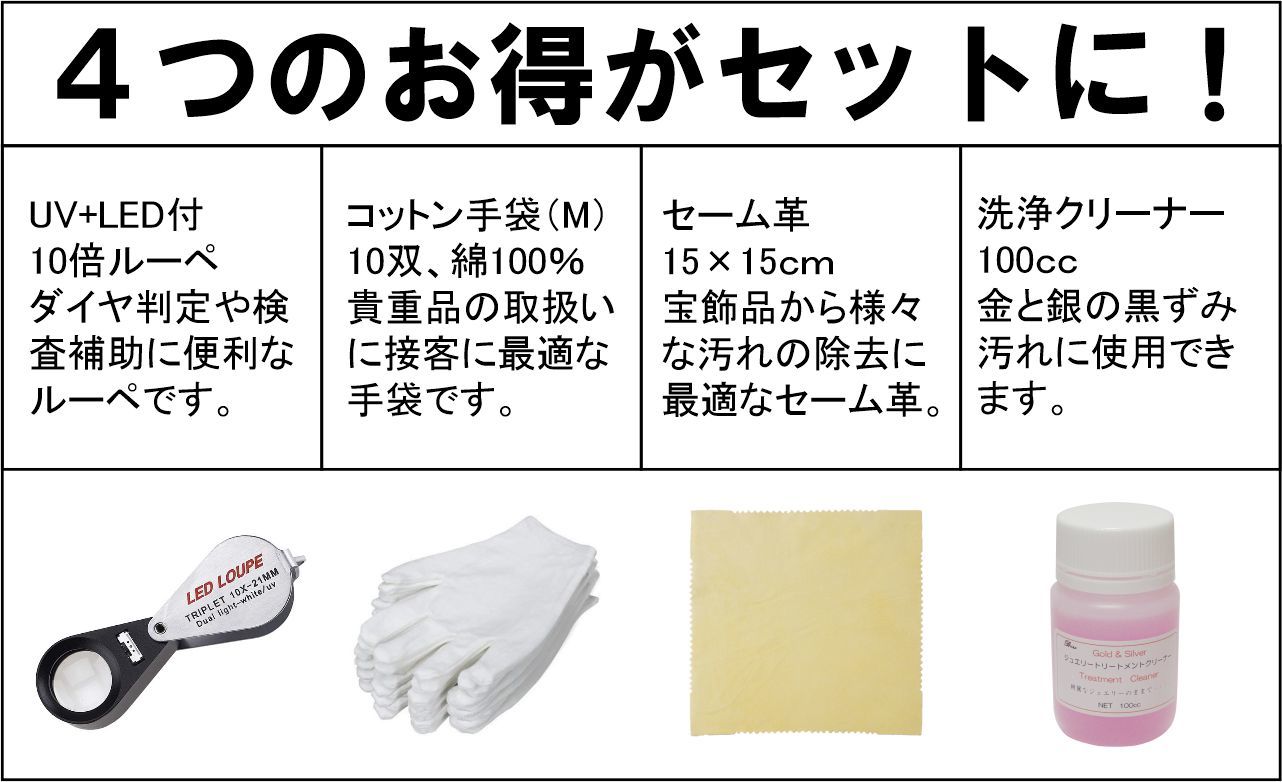 GKS-300 貴金属テスター プライスボード(L)セット販売 お買い得なセット販売です。通常購入価格より16000円以上お得です。 その他、ルーペ、手袋、クリーナー、セーム革がセットになってます。 209,800円(税別) |