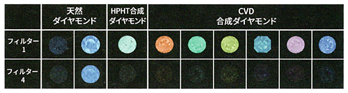 交換する2種類のフィルターを使用してダイヤモンドに照射し、蛍光及び燐光反応を発生させその