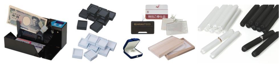 ジュエリーショップ、時計販売店、質店、貴金属、宝石買取り店などの店舗備品、接客用品、値札、販売品質保証書、ストックケース、宝石判定検査機器、貴金属鑑定鑑別機器、ジュエリーや時計の手軽にできるお手入れ用品などです。